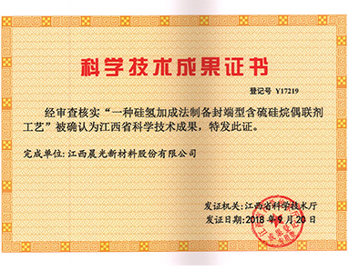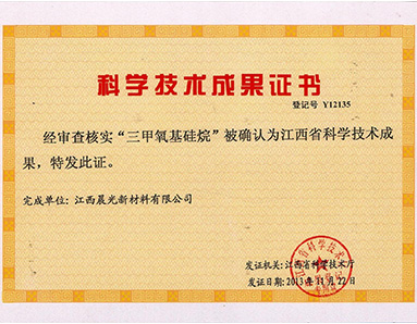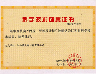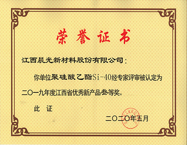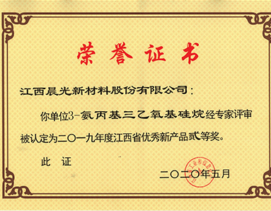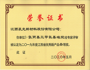 | 05 | Polysilicate ethyl ester Si-40 product was awarded the "Jiangxi Province 2019 New product Third Prize" honor by Jiangxi Provincial Department of Industrial Information Technology. 3-chloropropyl trimethoxy-silane products were awarded the "Third Prize of New Products in 2019 in Jiangxi Province" by Jiangxi Provincial Department of Industrial Information Technology. 3-aminopropyl triethoxysilane products were awarded the "Second Prize of New Products in 2019 in Jiangxi Province" by Jiangxi Provincial Department of Industrial Information Technology. |