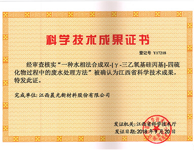 | 09 | "A wastewater treatment method for the synthesis of bis -[γ-triethoxy-silicopropyl] -tetrasulfide by aqueous phase method" was awarded the honor of "Scientific and Technological Achievements of Jiangxi Province" by the Science and Technology Department of Jiangxi Province. "A process for preparing end-sealed sulfur-containing silane coupling agent by silohydroaddition method" was awarded the honor of "Scientific and Technological Achievements of Jiangxi Province" by Jiangxi Provincial Science and Technology Department. |