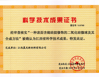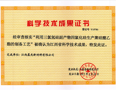 | 03 | "A silica microsphere modified with sulfur-silane surface and its synthesis method" was awarded the honor of "Scientific and Technological Achievements of Jiangxi Province" by the Science and Technology Department of Jiangxi Province. "The preparation process of polysilicate ethyl ester using silicon tetrachloride as a by-product of trichlorohydrosilicane" was awarded the honor of "Scientific and Technological Achievements of Jiangxi Province" by Jiangxi Provincial Science and Technology Department. "3-chloropropyl trialkoxy silane cleaner production method" was awarded the honor of "Scientific and Technological Achievements of Jiangxi Province" by the Science and Technology Department of Jiangxi Province. Hukou County Safety production Committee awarded the honor of "2016 County Advanced unit of safety production work". |