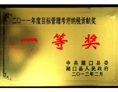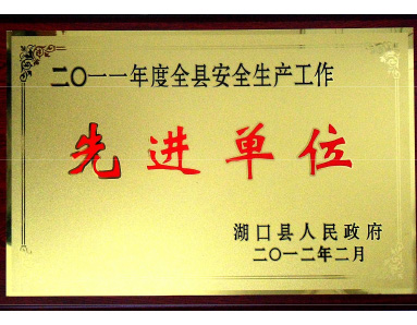 | 02 | Jiujiang Municipal Committee of the Communist Party of China and Jiujiang Municipal People's Government jointly awarded the "2011 Municipal Industrial Development Enterprise Contribution Award". Hukou County People's Government awarded the honor of "2011 County Advanced unit of safety production work". Hukou County Party Committee and Hukou County People's Government jointly awarded the "2011 annual target Management Evaluation tax Contribution Award First Prize" honor. |